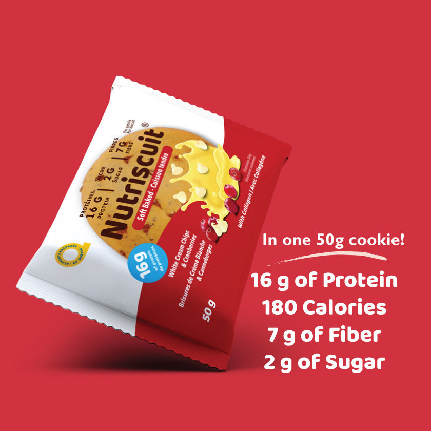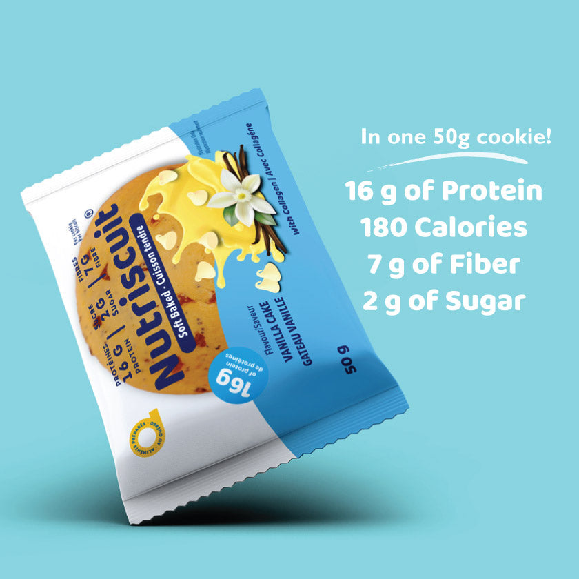 For a healthy body and mind, it’s important to have a balanced intake of various nutrients. Nutriscuit offers a healthier alternative to the traditional, sugar packed cookie, by only containing 2 grams of sugar. To balance it all out, our cookies contain an additional 7g of fiber and 16g of protein to promote healthy muscular and bone strength.